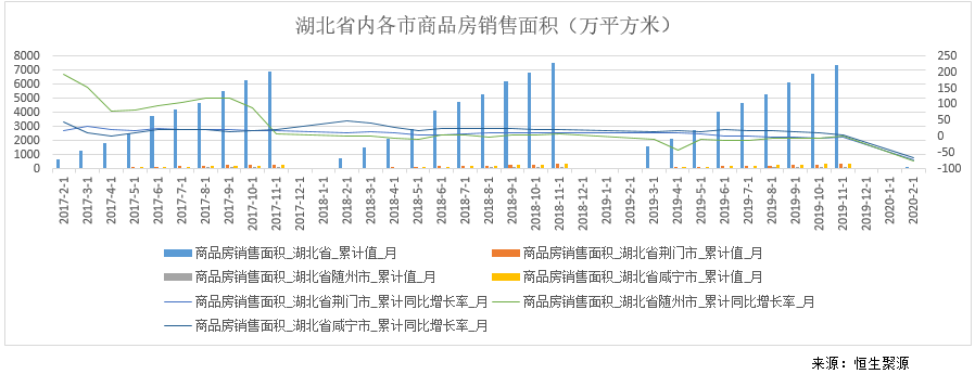 2020年2月,湖北省商品房销售面积累计146.97万平方米,其中荆门市商品房销售面积累计15.18万平方米,同比下降71.5%,随州市商品房销售面积累计4.8万平方米,同比下降76.5%,咸宁市商品房销售面积累计15.28万平方米,同比下降65%。受疫情影响,商品房销售承压现象比较明显。