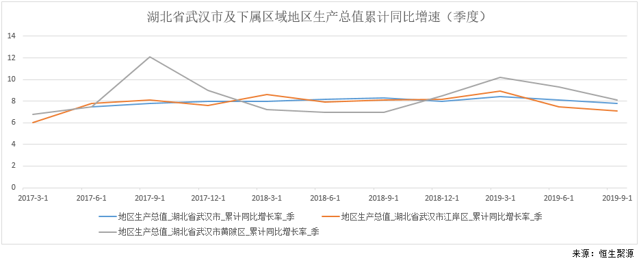 2019年3季度,武汉市地区生产总值同比累计增速7.8%,武汉市江岸区地区生产总值同比累计增速7.1%,黄陂区生产总值同比累计增速8.1%。青山区生产总值同比累计增速7.2%。