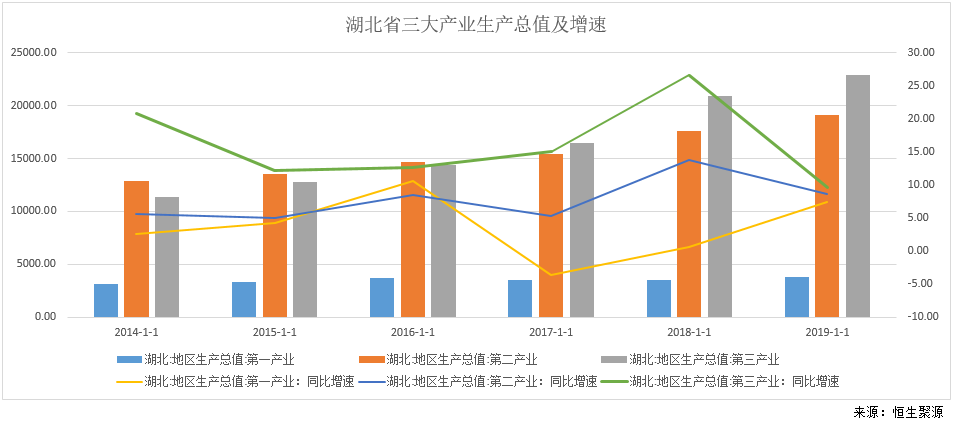 2019年,湖北省第一、第二、第三产业的生产总值分别为3809.09亿元、19098.6亿元、22920.6亿元,同比分别增长:7.35%、8.68%、9.67%。2019年,湖北省第三产业生产总值的增速有明显下滑。